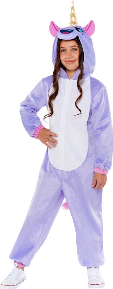 Dětský kostým Jednorožec ve fialové barvě s bílým břichem. Plyšový overal má na přední straně zapínání na zip, růžový ocas a kapuci zdobenou růžovými oušky, jednorožčím obličejem a zlatým rohem, velikost 116-128 cm (6-8 let). Ošetření textilu: ruční praní ve studené vodě.