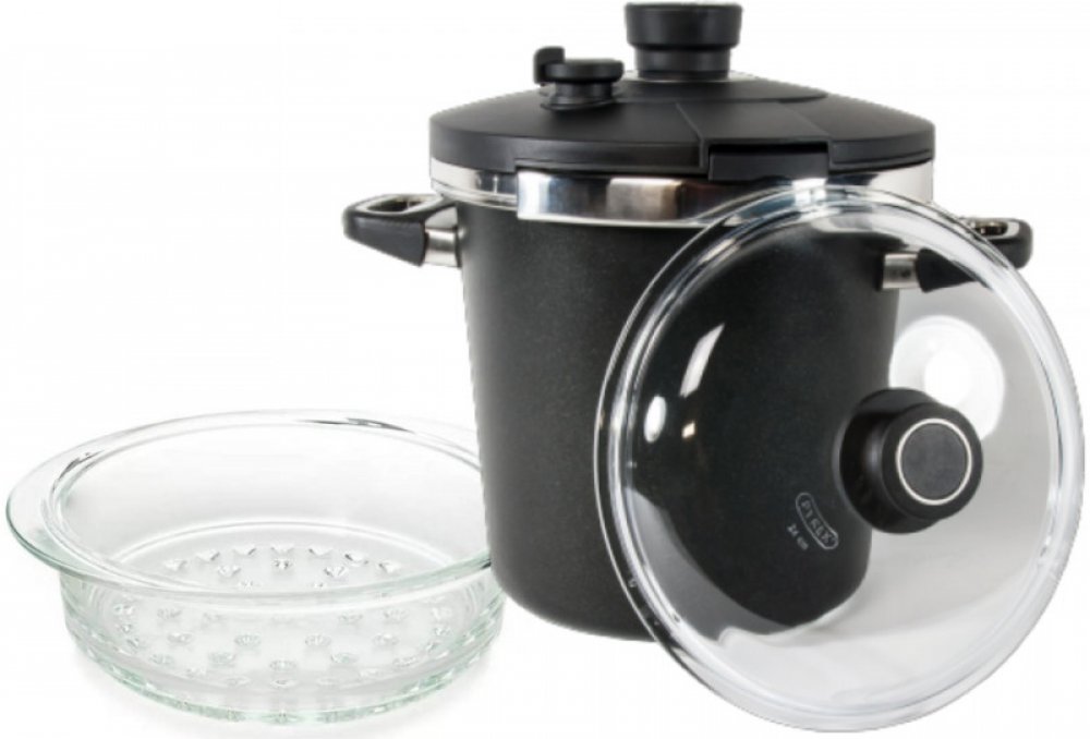 Titanový 7 l tlakový hrnec indukční s napařovacím setem Naše titanové tlakové hrnce jsou opatřeny několika bezpečnostními prvky. Bezpečný uzavírací systém na poklici, ovladatelný jednou rukou. O čelová čelisti se zachytí o masivní okraj hrnce, což vylučuje možnost jakéhokoliv uvolnění poklice z nádoby. Pracovní ventil s možností nastavení síly vaření ve dvou stupních I. nebo II. Bezpečnostní venti...