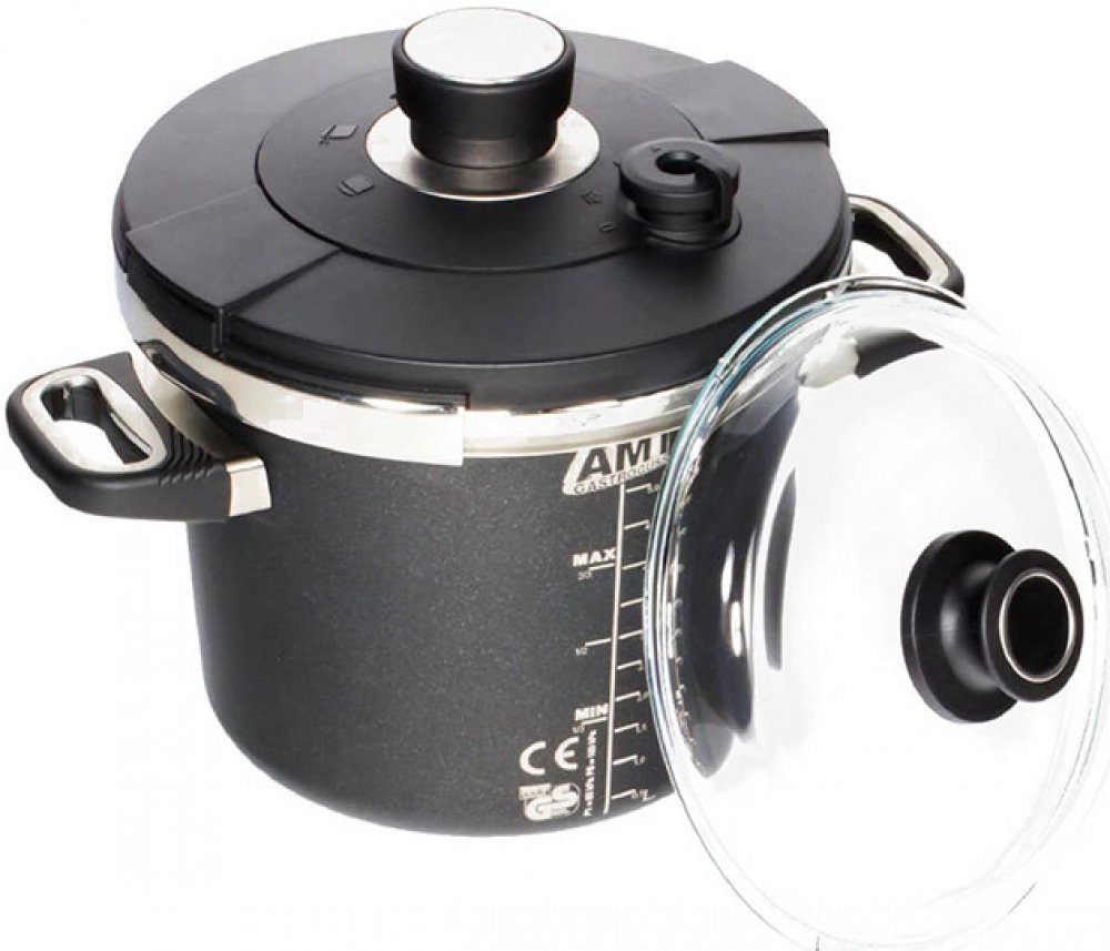 Titanový indukční tlakový hrnec o objemu 4 l se dvěma poklicemi Naše titanové tlakové hrnce jsou vybaveny několika bezpečnostními prvky. Bezpečný systém uzavírání na poklici, který lze ovládat jednou rukou. Ocelové čelisti se zachytí o pevný okraj hrnce, čímž se vyloučí možnost jakéhokoli uvolnění poklice z hrnce. Pracovní ventil s možností nastavení síly vaření ve dvou stupních I nebo II. Bezpečn...