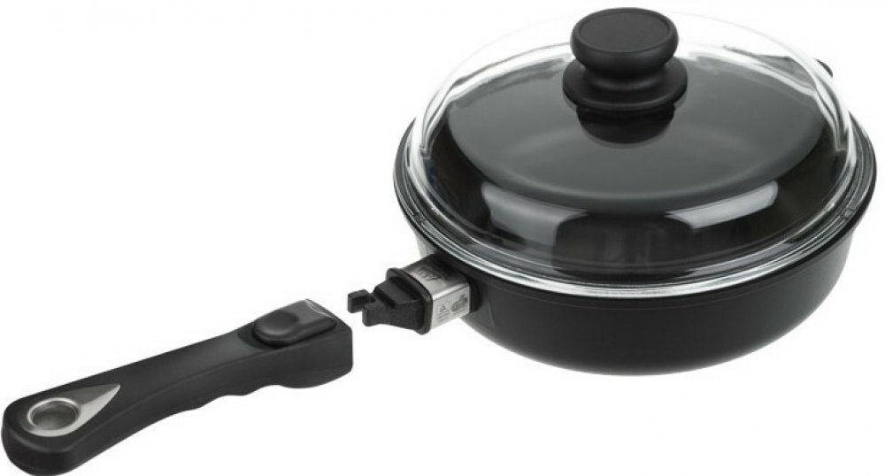 Indukční titanovu pánev ø 28 cm x 7 cm, 3.6 l s odnímatelnou rukojetí, nepřilnavým povrchem a skleněnou poklicí doporučujeme pro přípravu masových, zeleninových a jiných směsí, ale i pro smažení ve velkém. Vysoký okraj pánve umožňuje snadnější míchání pokrmů během dušení nebo smažení.
