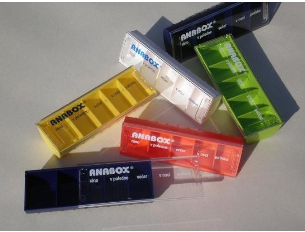 DÁVKOVAČ LÉKŮ DENNÍ Anabox má 5 přihrádek na léky, z nichž je největší přihrádka na ranní dávku léků. K dispozici je také jedna přihrádka navíc pro případ potřeby. Jedinečná konstrukce mechanismu víčka umožňuje snadné plnění a vyjímání léků (víčko denního dávkovače lze sejmout), což ušetří mnoho času v podmínkách profesionálně poskytovaných služeb (zdravotní sestry, domovy důchodců, pečovatelské služby). Výstupky na krabičce denního dávkovače na léky umožňují snadnou manipulaci a zakulacený tvar snadné vybírání léků a lepší využití objemu. Kvalitní materiál zabezpečí ochranu před světlem. Velmi snadná manipulace, také pro třesoucí se a revmatem postižené ruce. Výrobek je k dostání v několika barevných variacích. Pokud preferujete určitou barvu (bílá, modrá), prosím, napište do poznámky k objednávce svůj výběr. Pokusíme se zajistit Vámi požadovanou barvu.
