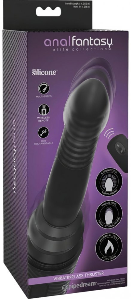 Užij si ekologický přístup a pořádné potěšení s nenápadným, znovupoužitelným vibrátorem prémiové kvality, který rozmazlí všechny tvé smysly!Proč si ho zamiluješ?Unikátní tlačící, vibrační a zahřívací funkce napodobuje pohyb dovnitř a ven, jako by do tebe znovu a znovu pronikal neúnavný tvrdý penis, ať už do kundičky nebo do zadečkuLehký, ale pevný a kvalitní plastový základFunkce zahříváníPovrch pokrytý maximálně šetrným silikonem, který je na dotek příjemně měkkýDíky extra silné přísavce můžeš zkoušet různé polohyBezdrátový rádiový ovladač - jednoduché ovládání bez otravných kabelů7 vibračních režimů pro různorodé potěšení8 tlačících rytmů pro opravdu divoké zážitkyFunkce zahřívání - dokáže se ohřát až na 40 °CVstavaná baterie - nemusíš řešit baterkyPřísavka je odnímatelná, takže můžeš hrát i bez níNa co si dát pozor: Produkt není vodotěsný, takže při čištění se snaž, ať se voda nedostane k elektronickým částem - silikonové krytky musí správně sedět. Pro použití s lubrikantem doporučujeme výhradně lubrikační gel na vodní bázi. Ovládání: Zapínání/vypínání, tvrdost pohybů a vibrační režimy řídíš samostatnými tlačítky.Spodní tlačítko: ZahříváníStřední tlačítko: Přepínání mezi vibračními režimyHorní tlačítko: Pohyb nahoru a dolůOvládání dálkovým ovladačem:Přístroj lze pohodlně ovládat dálkově. (Funkce ohřevu se zapíná pouze přímo na produktu.)Spodní tlačítko na ovladači: Přepínání vibračních režimůHorní tlačítko na ovladači: Pohyb nahoru a dolůPřipojení USB nabíječky: Nabíječka se připojí na spodní část ovladače vibrátoru, kde je malá silikonová krytka, kterou stačí otevřít. Technické parametry a vlastnosti: Tlačící, vibrační a zahřívací funkceBaterie nabíjitelná přes USBSilikon šetrný k pokožceSametově hebký povrchPevné těloExtra silná, odnímatelná přísavkaLze ovládat také bezdrátovým dálkovým ovladačem8 úrovní pohybu7 vibračních režimůZahřívání až na 40 °COdděleně ovladatelné funkceJednoduché tří-tlačítkové ovládáníCelková délka: 30,5-33,8 cmVložitelná délka: 15,2 cmPrůměr: 3,6-6,4 cmHmotnost: 657 gčerná barvamateriály: ABS, šetrný silikon (splňuje EU normy, bez ftalátů)Čištění produktu: Důkladně omyj vlažnou vodou a jemným mýdlem, opláchni a nech uschnout. Doporučujeme použít speciální čistič (8718627520062) - objednává se zvlášť.Podívej se na video s představením Analfantasy Ass Thruster - tlačící anální vibrátor (černý)!