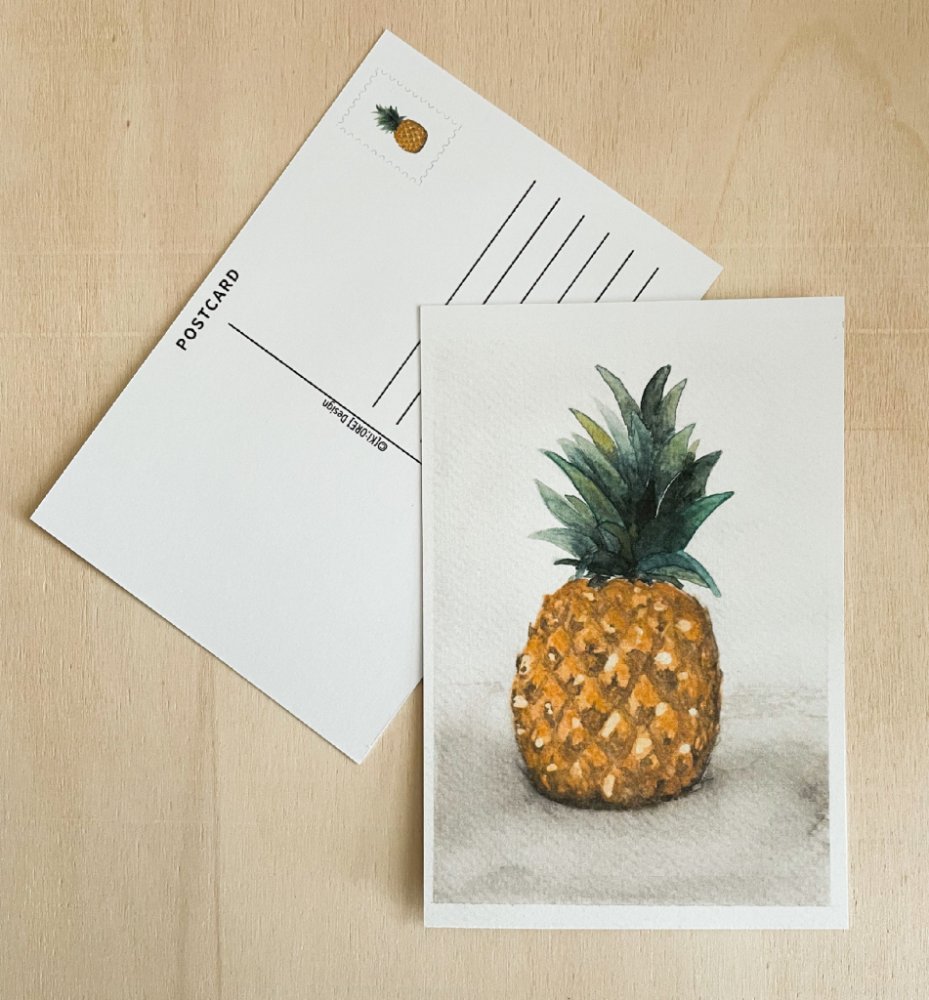 Pohlednice s tiskem autorské akvarelové ilustrace ananasu. Rozměry cca 15 × 10,5 cm (rozměry se můžou lišit vlivem ručního ořezu).