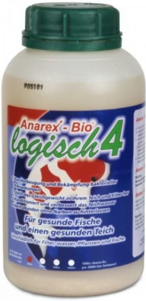 Proč koupit Anarex Bio pro ošetření onemocnění a ran KOI: účinný, 100% přírodní multifunkční produkt zničí 95% bakterií způsobujících onemocnění, a tím výrazně sníží riziko onemocnění KOI slouží k zahojení ran bez jizev  včasná aplikace Anarex Bio zlepší výsledek ošetření ran u KOI optimalizuje trávení a pomáhá řešit vnitřní překážky v zažívacím traktu snižuje riziko napadení KOI ektoparazity (posiluje a  vyhlazuje kůži KOI)  účinně zvyšuje imunitu KOI obsahuje velké množství stopových prvků a minerálů nezbytných pro zdravý růst a vývoj KOI obnovuje rovnováhu v jezírkové vodě a jezírkovém filtru, zlepšuje kvalitu vody v jezírku urychluje rozpad organických zbytků v zahradním jezírku  účinně přispívá ke snížení hodnot amoniaku a dusičnanů v zahradním jezírku  dlouhodobě testován v mnoha zemích EU nehrozí žádné riziko předávkování   Upozornění: Nepůsobí proti virovým onemocněním. Chladnější teplota vody zpomaluje účinky.   Používáním Anarex Bio se můžete vyhnout nutnosti ošetření antibiotiky a jinými léky, které mají negativní dopad na růst a vývoj vašich KOI. Prevence proti onemocněním způsobeným zejména bakteriemi rodu Aeromonas a Pseudomonas. Optimalizuje trávení, výsledkem fungujícícho trávení je KOI odolný proti chorobám s perfektním růstem a tělesnou stavbou. Nedochází k vytvoření rezistence, možno používat pravidelně, nemá žádné vedlejší účinky. Neuvolňuje žádné nebezpečné látky a rezidua. Obsahuje bakterie mléčného kvašení, mléčné kyseliny, enzymy a kvasinky. Bezpečný pro nitrifikační bakterie, rostliny, ryby, ptáky, domácí mazlíčky i lidi.   Skladování Anarex Bio:  neotevřené balení lze skladovat po dobu tří let na chladném a tmavém místě po otevření lze skladovat po dobu přibližně jednoho roku na chladném a tmavém místě před použitím vždy protřepat pokud je obsah zkažený, nelze ho již použít skladování v lednici není nutné u skladovacích teplot nižších než 30 °C chraňte Anarex Bio před mrazem, minimální skladovací teplota 2 °C
