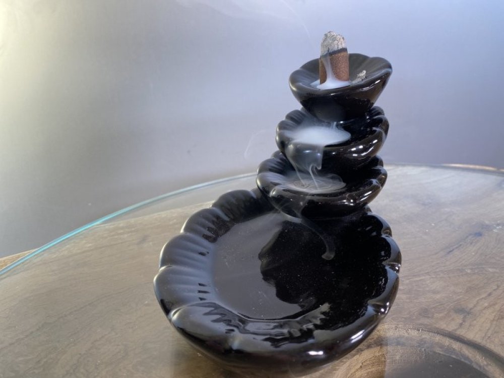 Kameninový stojan na vonné kužele ve tvaru květu. Kouř po vypálení zhruba poloviny kuželíku začne klesat, a posléze téct jako mléko přes vertikální rýhy stojanu směrem dolů. Je dobré pod stojánek dát podložku tak, aby kouř nezašpinil ubrus. Stojan je uvnitř dutý s otvorem v horní části, díky čemuž vzniká zpětný tah v následně tedy popsaný efekt, kdy kouř z větší části klesá, teče po stojánku jako po schodem, místo aby stoupal vzhůru. Jednoduchá záležitost s nádherným efektem. V našem obchodě nabízíme i sortiment vhodných vonných kuželíků.