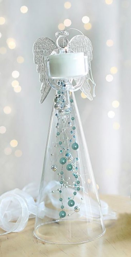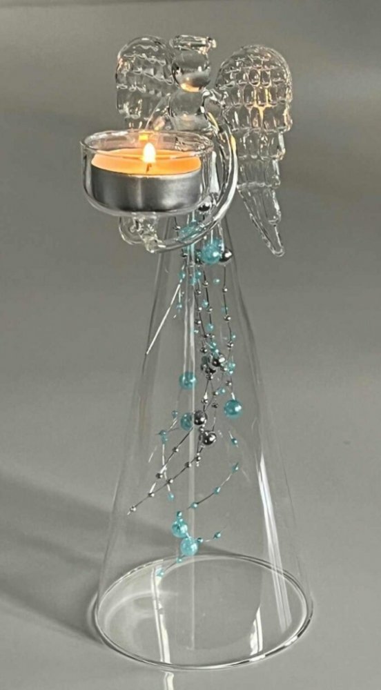Anděl čirý s modrými skleněnými perlami na čajovou svíčku výška 25cm