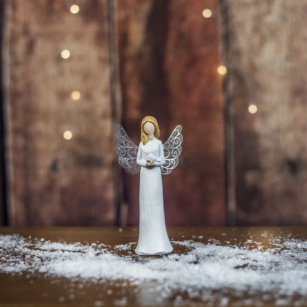 Dekorační anděl.Rozměry : 7 x 3 cm, výška 15 cm.Barva : bílá.Materiál : polyresin, křídla kovová.