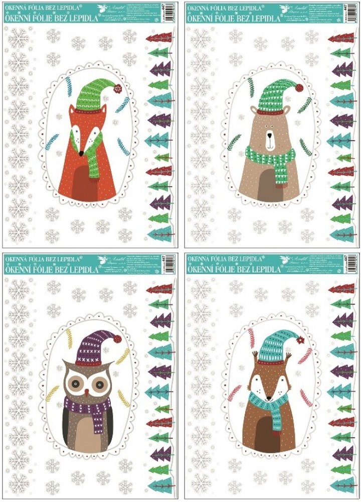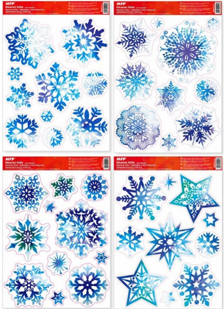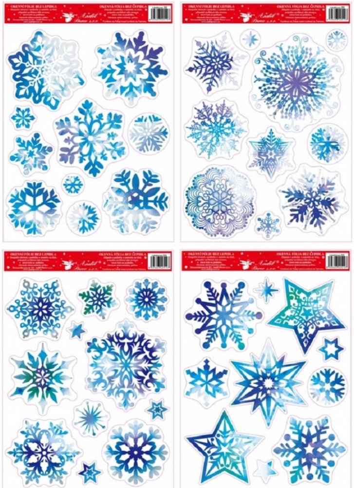Dekorační okenní fólie neobsahující lepidlo. Na plochu přilnou elektrostaticky a nezanechávají tedy po sobě žádnou stopu. Vhodné jsou pro jakékoli hladké plochy, například na sklo, výlohy, zrcadla nebo kachličky. Jsou opakovaně použitelné. Použití: 1. Doporučujeme před použitím plochu očistit od prachu a jiných nečistot. 2. Fólie se snadno aplikuje sejmutím z podkladového papíru a umístěním na hladkou plochu. 3. Fólii přiložte a vyhlaďte případné bublinky rukou nebo suchým hadříkem. 4. Po použití je možné je uložit na původní podkladový papír a uskladnit na další sezónu.