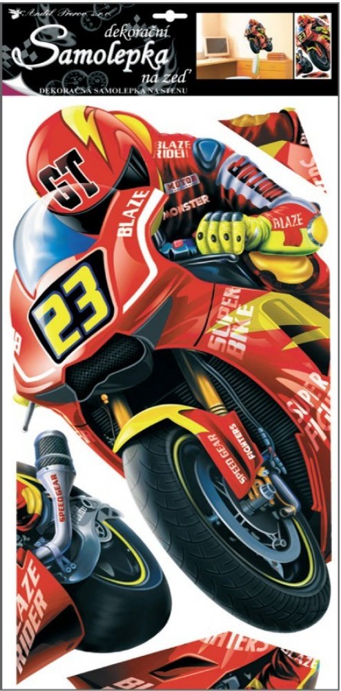 Samolepky na zeď motorka 60x32cm Snadné použití! Vhodné na stěny, okna, zrcadla, kachličky a jiné hladké plochy! NÁVOD: Opatrně sejměte samolepku z podkladového papíru a umístěte ji na zvolenou suchou a čistou plochu. Vyhlaďte od středu ke krajům.