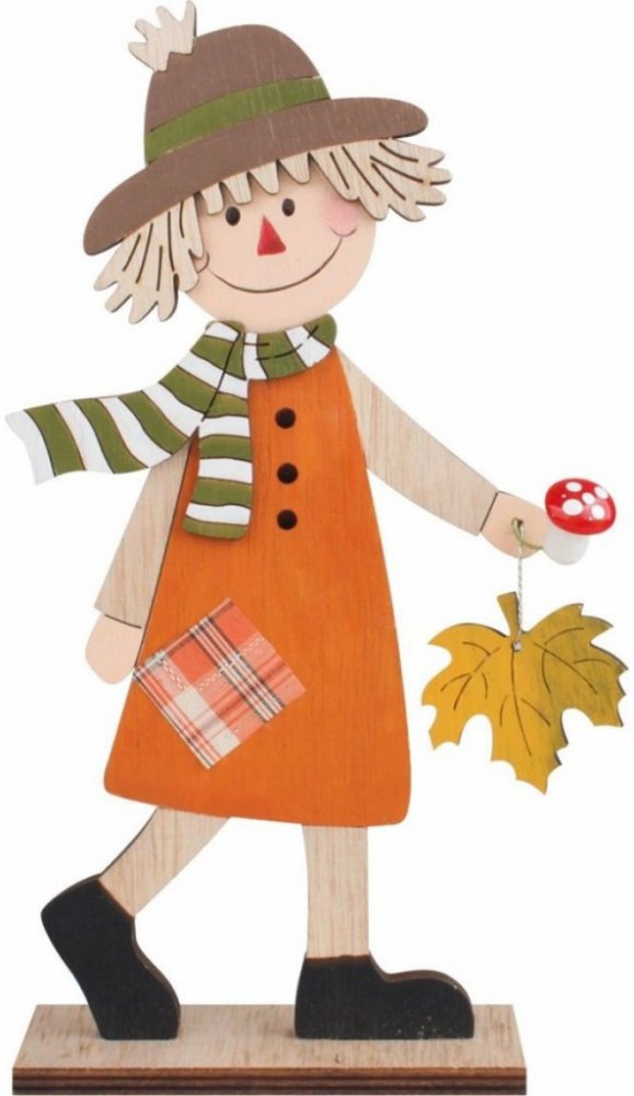 Dřevěný panáček v kloboučku a se šálou kolem krku je ztvárněn ve 2D formátu. V ruce nese symbolický, podzimem zbarvený lístek javoru a houbičku.
