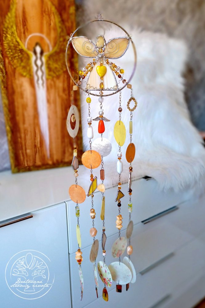 Andělská vitrážová cínovaná zvonkohra je s láskou ručně vyrobené, pracované technikou Tiffany - technika skleněných katedrálních oken.