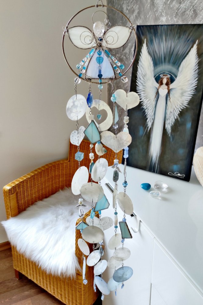 Andělská vitrážová cínovaná zvonkohra je s láskou ručně vyrobené, pracované technikou Tiffany - technika skleněných katedrálních oken.
