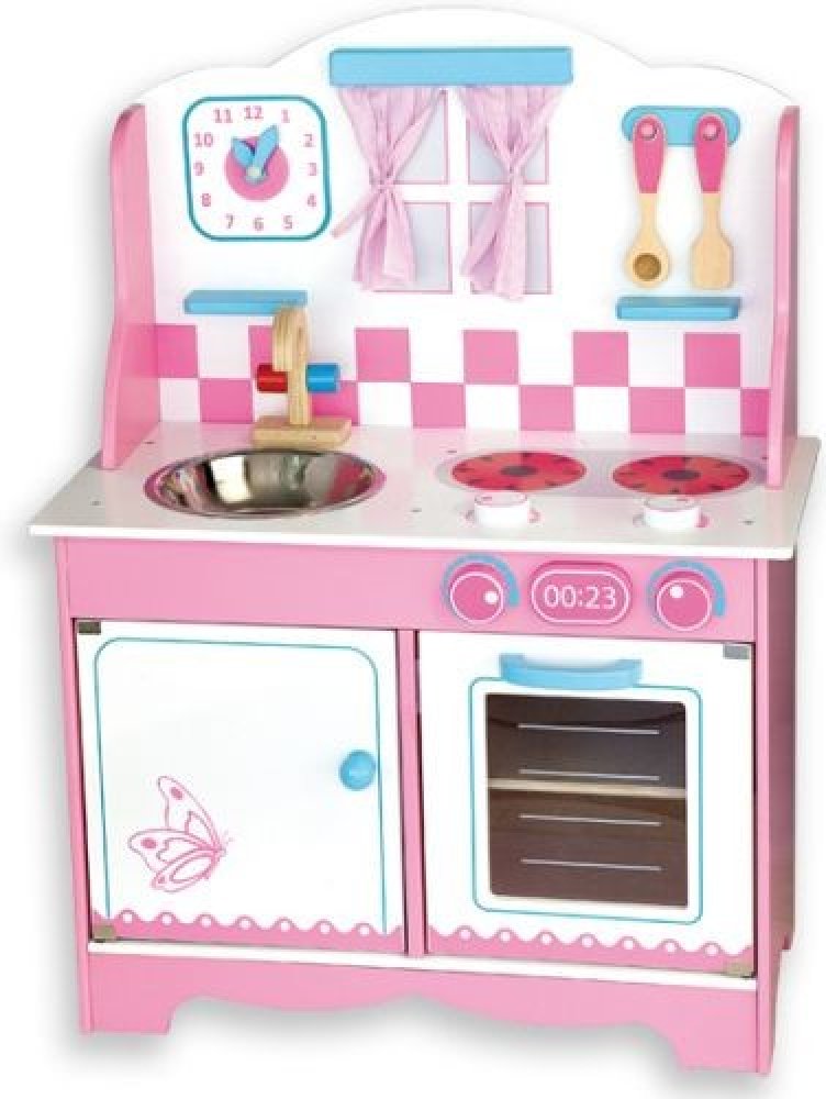 Tato kuchyně s atraktivním designem poskytne mnoho hodin zábavy pro budoucí kuchaře a kuchařky. Obsahuje lžíci a špachtli, hodiny s pohyblivými šipkami, otáčecí ovládací prvky, úložný prostor pod dřezem, hořáky, troubu, závěsy a mnoho dalšího.