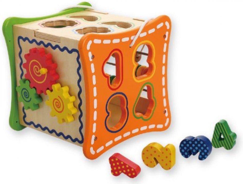 Krásná motorická kostka se šňůrkami, ozubenými koly, geometrickými tvary, číslicemi a počítadlem. Pomáhá dětem rozvíjet schopnost koordinace ruka - oko. Tyto různé aktivity poskytují dětem dlouhotrvající zábavu a rozvíjejí fantazii. Jasné a veselé barvy a snadno udržované součásti podporují kreativní hru. Vyrobeno z kvalitního dřeva, má hladké broušené dřevěné části.