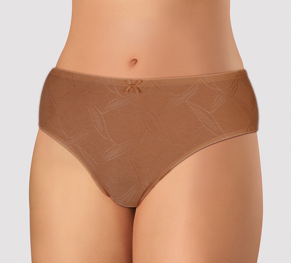 Dámské kalhotky klasického střihu. Kalhotky jsou vyrobeny z kvalitní elastické bavlny s příměsí elastanu pro větší pružnost tkaniny a větší pohodlí. Na předním díle je hezký žakár a zadní díl je hladký. V pase a kolem nohaviček je zašitá pruženka. Bavlněný klínek.