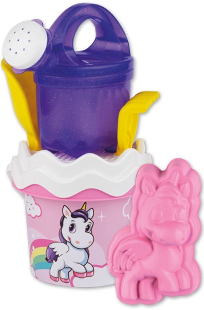 Obsahuje: Kyblík, konvičku 0,5 l, sítko, lopatku, hrabičky a tvořítko ve tvaru jednorožce.