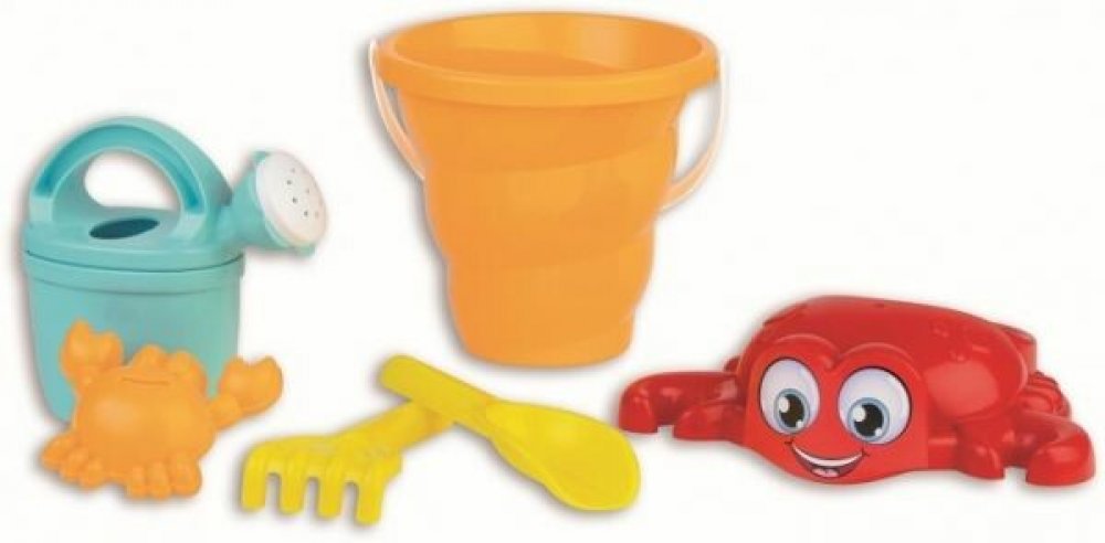 6dílná sada na písek, vyrobená z kvalitních plastů v Itálii. Obsahuje: Kyblík připomínající tvar lastury, sítko s veselým krabem, tvořítko ve tvaru kraba, konvičku, lopatku a hrabičky.