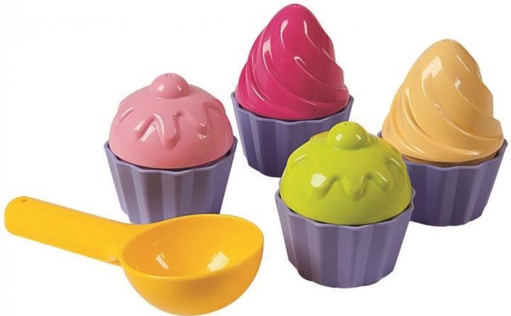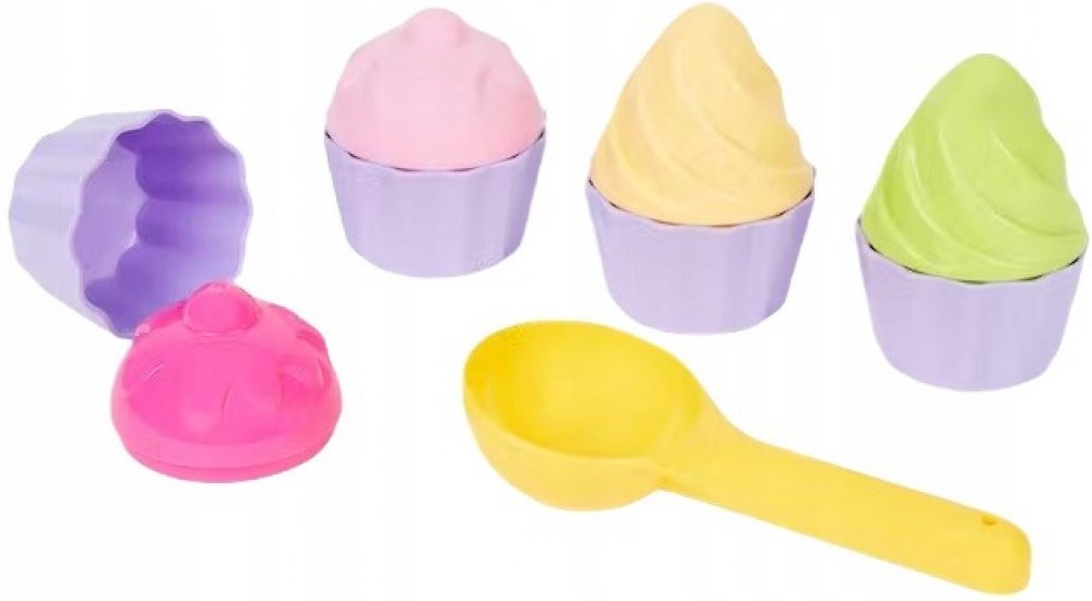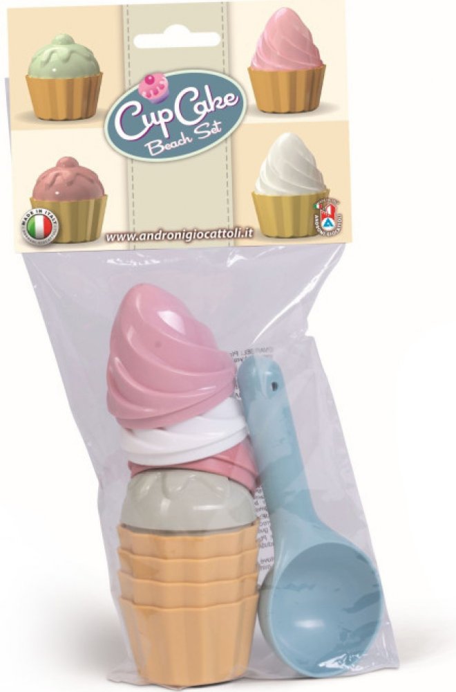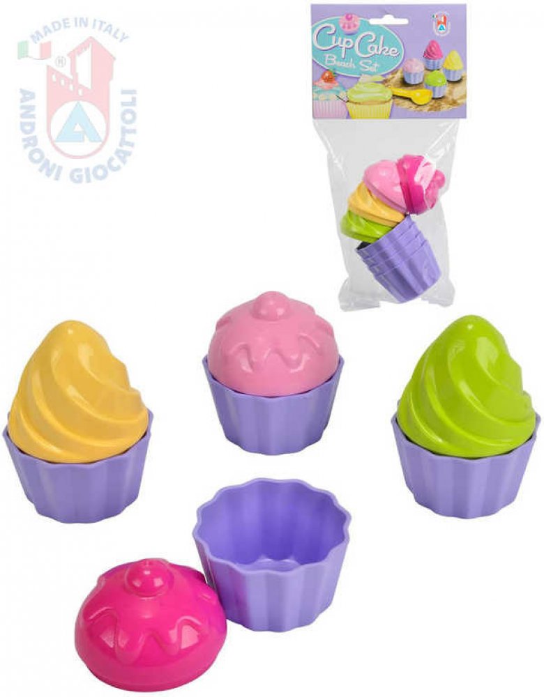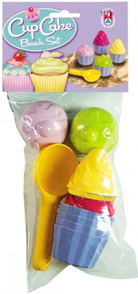 9dílná sada tvořítek na písek - dortíky. Vyrobeno z kvalitních plastů v Itálii. Obsahuje: Lopatku na zmrzlinu a 8 tvořítek na dortíky.