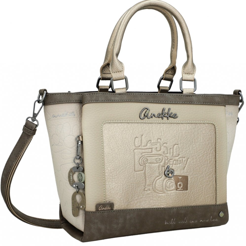 Dámská kabelka Anekke v barevném provedení hnědá, béžová, pudrová a zlatá má dvě ucha do ruky výška (16cm) a odnímatelný nastavitelný popruh přes rameno (125cm). Na přední a zadní straně kapsa s uzavíráním na magnet. Uzavírání kabelky je na zip. Uvnitř dvě kapsy otevřené a jedna kapsa na zip.