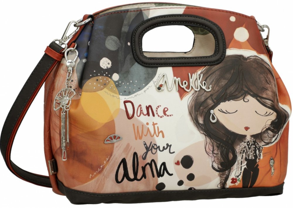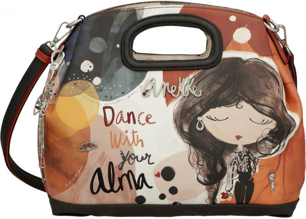 Dámská jednokomorová kabelka do ruky, vyrobená z kvalitní syntetiky a textilní podšívky. Kabelka má celkem šest kapes a je zdobena krásnými propracovanými detaily. Každý produkt firmy Anekke je jedinečně zpracován pomocí ručních výšivek, štrasových kamínků, pentliček, kapes a mnoha dalších důvtipných maličkostí.