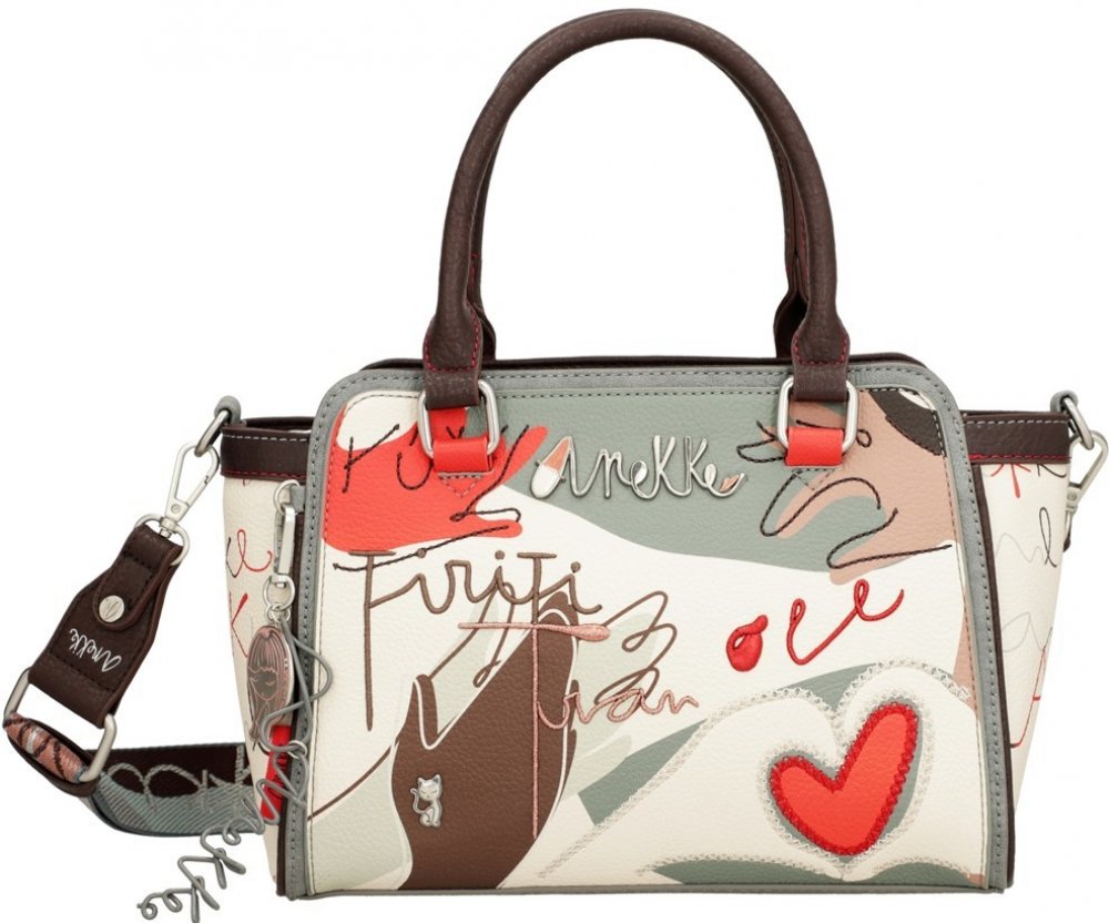 Dámská jednokomorová kabelka do ruky, vyrobená z kvalitní syntetiky a textilní podšívky. Kabelka má celkem pět kapes a je zdobena krásnými propracovanými detaily. Každý produkt firmy Anekke je jedinečně zpracován pomocí ručních výšivek, štrasových kamínků, pentliček, kapes a mnoha dalších důvtipných maličkostí.