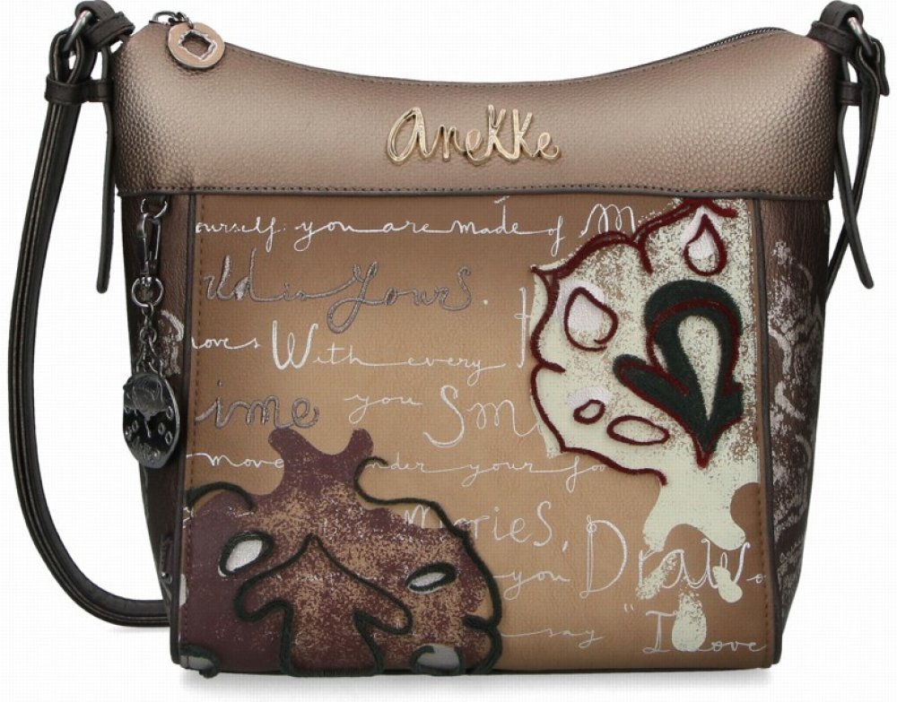 Kabelka má dlouhý popruh přes rameno a lze ji tak nosit jako crossbody. Na zadní straně je kapsa na zip. Kabelka má zapínání na zip. Uvnitř kabelky je kapsa na zip a dvě otevřené kapsy. Kabelka je balená v ochranném obalu.Značka Anekke je charakteristická svým precizním zpracováním a překrásným designem, který vás zaujme a okouzlí. Velmi originální a poetické kabelky a batohy Anekke budou dokonalým doplňkem pro denní nošení nebo pro večerní příležitosti. Kouzlo a romantika, to je svět Anekke.Rozměry: délka 24 - 31 cm, šířka 9 cm, výška 28 cmBarva: šedohnědáMateriál: 100% polyuretan, podšívka 100% PEPro čištění nedoporučujeme používat tekutá čistidla kvůli možnému zabarvení materiálu. Výrobek otírejte měkkým, bezbarvým, navlhčeným hadříkem.