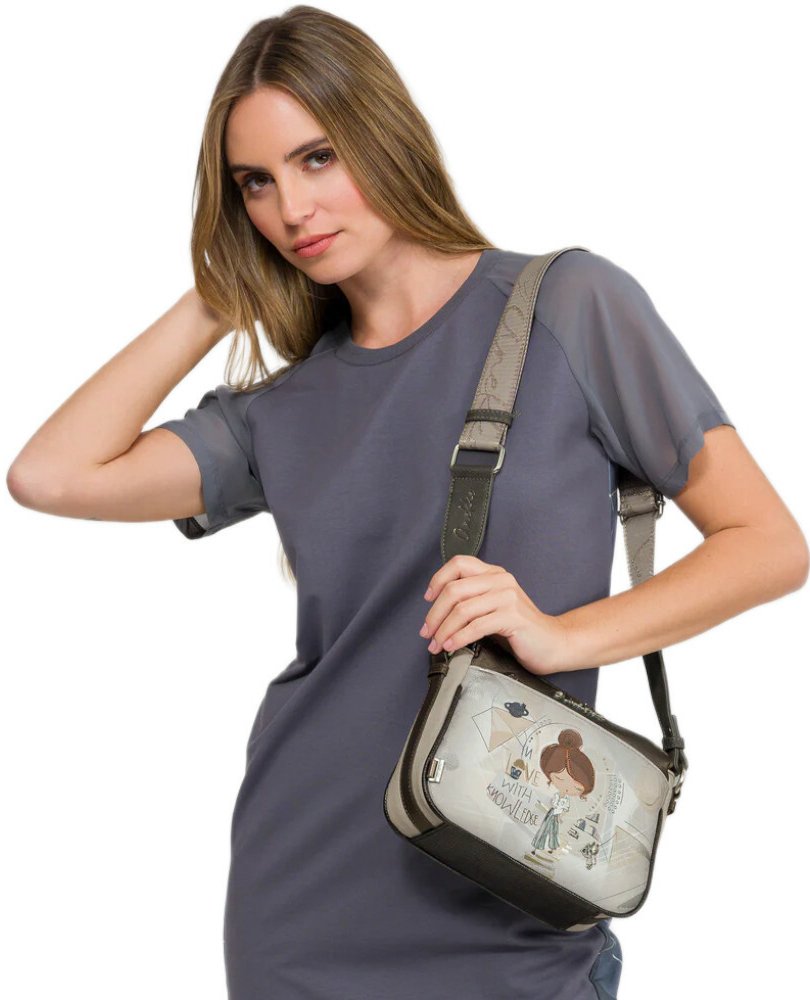 Dámská kabelka Anekke s jedním nastavitelným popruhem přes rameno, nebo šikmo přes rameno jako crossbody. Kabelka se uzavírá na zip. Na přední a zadní straně kabelky kapsa na zip. Uvnitř kabelky jedna kapsa na zip a jedna otevřená..