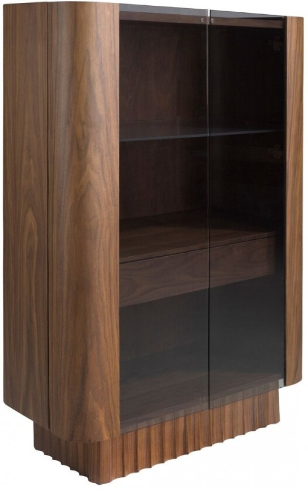 Tato vitrína z ořechové dýhy přinese do vašeho interiéru přírodní krásu a moderní eleganci. Vnitřní LED osvětlení podtrhne exkluzivní design a zvýrazní vystavené předměty. Detaily z tvrzeného skla dodají vitríně vzdušnost a lehkost. Praktické úložné prostory s tichým dovíráním dvířek a zásuvky zajistí maximální praktičnost při každodenním používání. Robustní podnož z masivního dřeva zajišťuje nejen stabilitu, ale i jedinečný designový prvek.