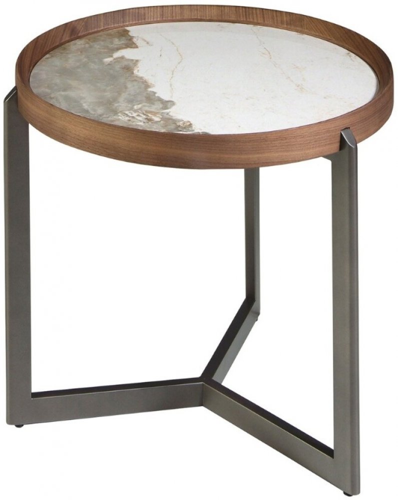Tento kulatý stolek z ořechového dřeva s deskou z bílého porcelánového mramoru je přesně tím designovým detailem, který dodá místnosti výjimečný nádech. Lesklá povrchová úprava a jemné žilkování v zemitých tónech krásně kontrastují s tmavou kovovou podnoží, která zajišťuje stabilitu i styl. Ideální jako stolek vedle křesla, pro šálek kávy nebo vaši oblíbenou vonnou svíčku. Díky svému elegantnímu k...