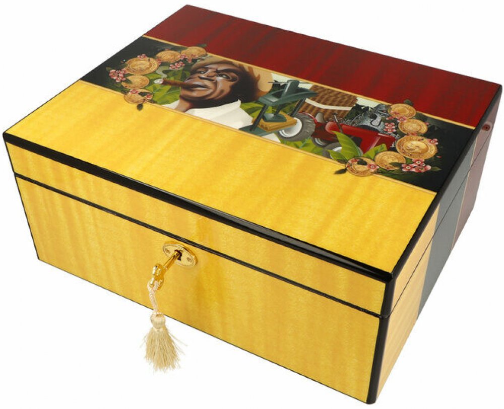 Stolní humidor na doutníky s kapacitou cca 30 doutníků. Dodáván s vlhkoměrem a zvlhčovačem. Vnitřek humidoru je vyložený cedrovým dřevem. Rozměr: 30x24x13 cm.