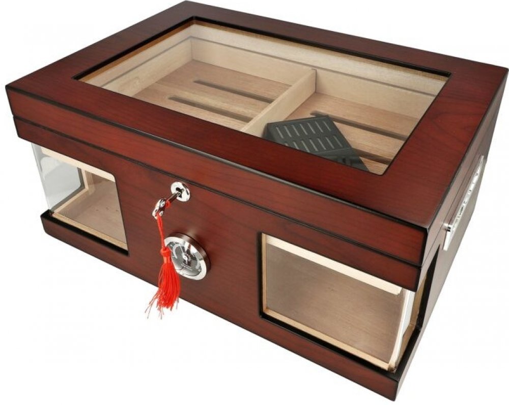 Stolní prosklený gastro humidor na doutníky s kapacitou cca 75 doutníků (v závislosti na velikosti). Uzamykatelný humidor ve hnědém provedení s kresbou má povrch v polomatném provedení. Horní a čelní strana je prosklená tvrzeným plexisklem. Na bočních stranách jsou umístěná praktická zapuštěná chromová madla. Díky zámku se dvěma klíči je tento humidor vhodný pro použití v gastro provozu. Prostor p...