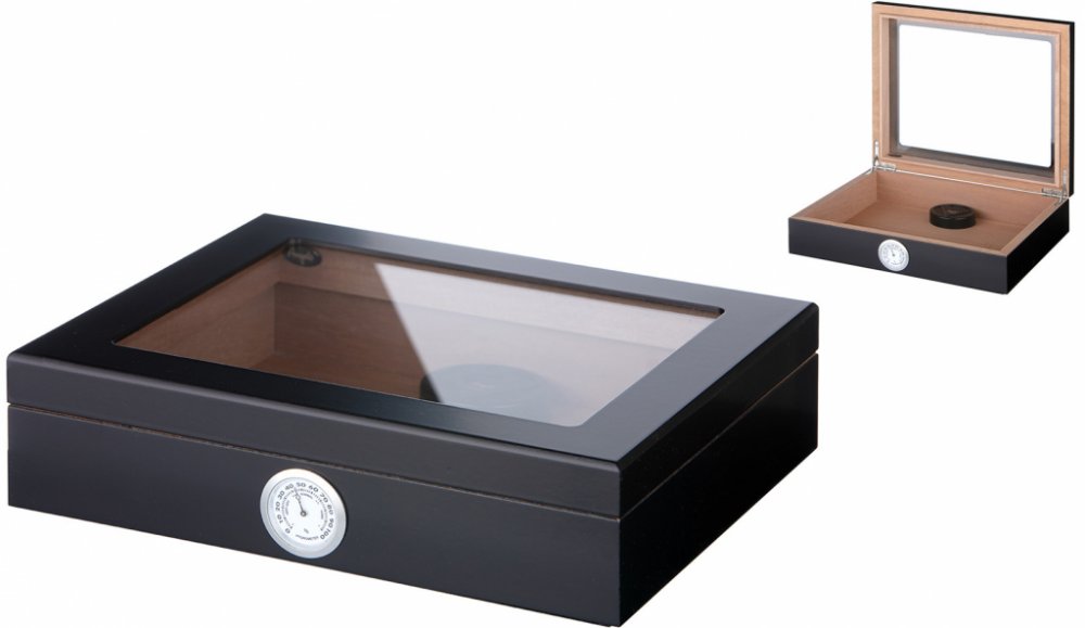 Humidor na doutníky Angelo z cedrového dřeva s klasickou povrchovou úpravou v matně černém lakování. Prosklené víko. Vlhkoměr a zvlhčovač je součástí humidoru.