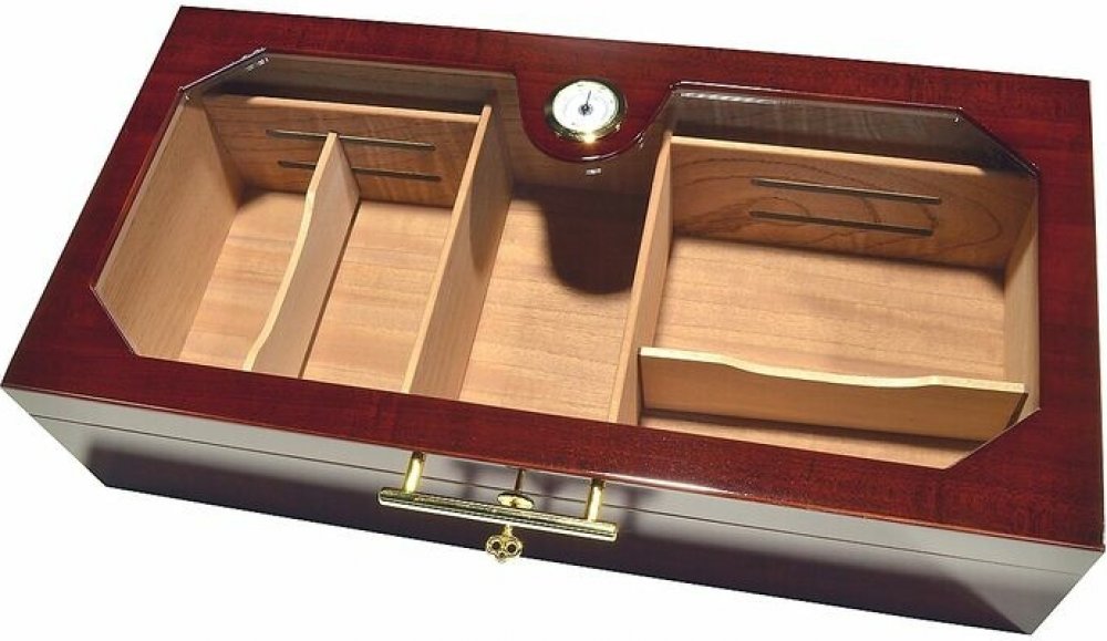 Stolní humidor na doutníky s kapacitou cca 150 doutníků. Ddodáván s vlhkoměr a zvlhčovač. Vnitřek humidoru je vyložený cedrovým dřevem. Rozměr humidoru 59x32x14-25cm.