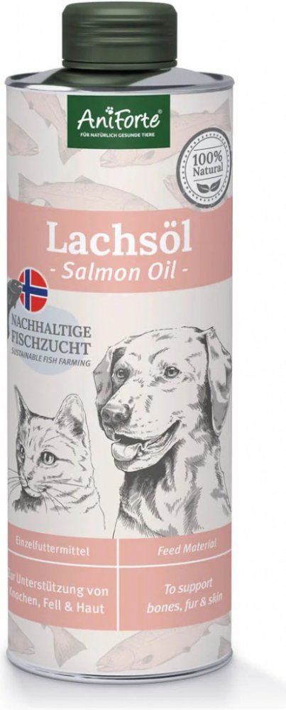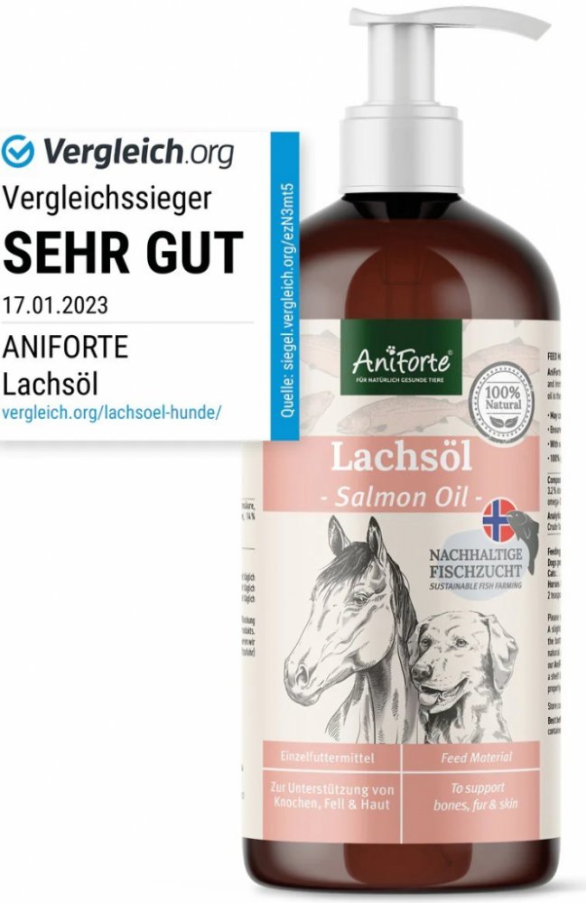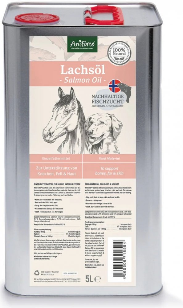 Lososový olej pro psy, kočky a koně - pro vyváženou stravuLososový olej AniForte® není vhodný pouze pro psy. Tento přírodní produkt podporuje také kočky a koně. Vysoce kvalitní rybí olej z Norska poskytuje přirozené, čisté živiny a přispívá tak k plnohodnotné stravě. Lososový olej jednoduše přimícháte do denního krmiva vašeho psa, kočky nebo koně. Pro svou druhově typickou chuť a vůni se těší vysoké míře jeho přijetí vaším miláčkem.