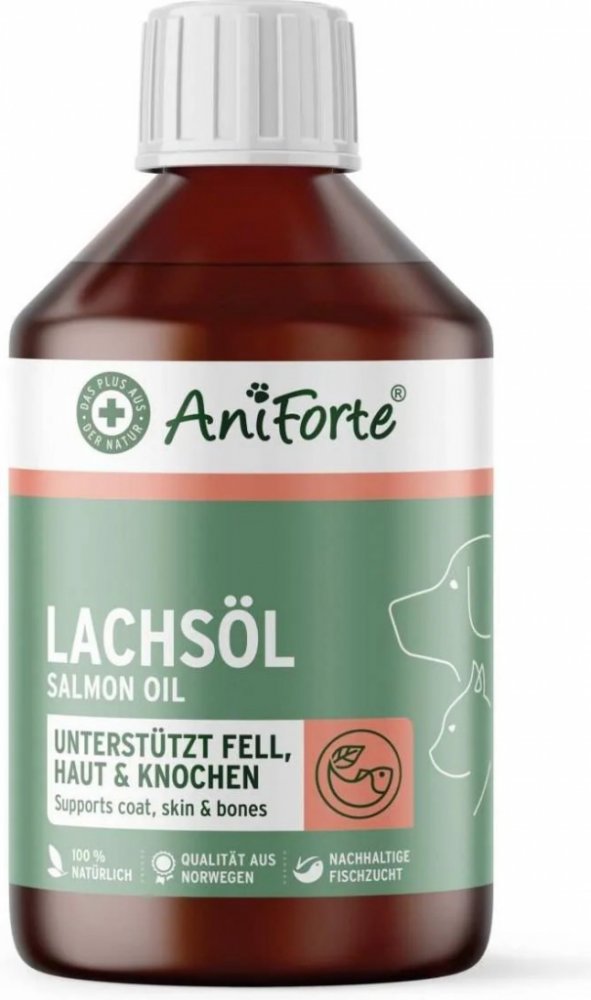 Mnoho vědeckých výzkumů již dokázalo prokázat účinek omega-3 mastných kyselin. AniForte® lososový olej pro psy, kočky a koně je skutečně všestranným doplňkem, který podporuje jak kardiovaskulární systém, kosti a klouby, tak kůži a lesklou srst. Kromě toho mohou omega-3 mastné kyseliny z lososového oleje podporovat funkci jater a ledvin. Jsou prospěšné pro neurologický vývoj zvířete a mají protizánětlivý účinek. S naším lososovým olejem pro psy, kočky a koně se můžete ujistit, že vašemu miláčkovi dodáte pro něj potřebné mastné kyseliny v prémiové kvalitě.