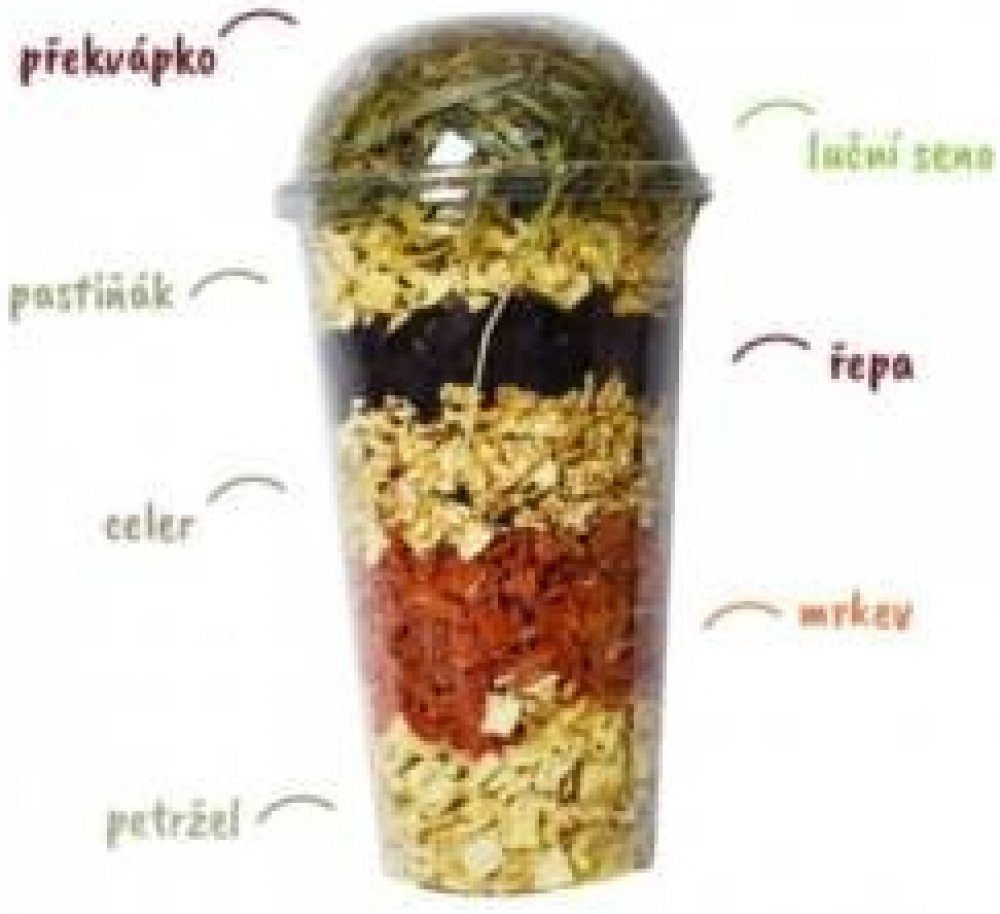 Složení: sušená mrkev, řepa červená, petržel, pastinák, celer, luční bylinné seno, květ slunečnice