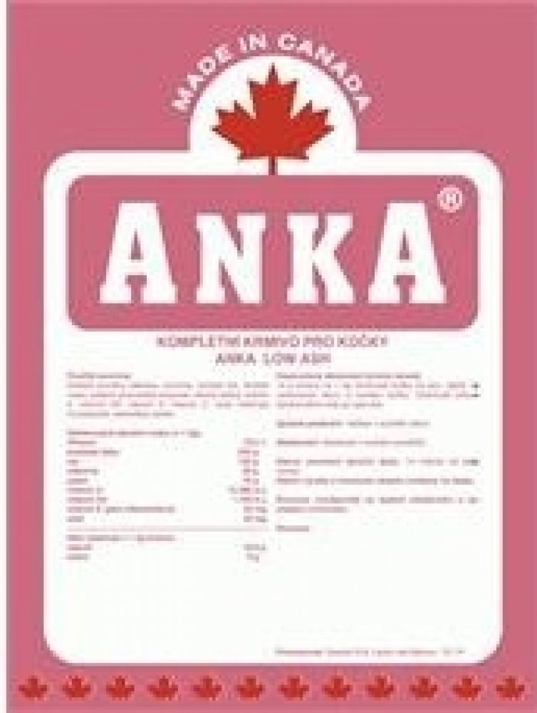 Použité suroviny krmiva pro kočky Anka Low Ash:Drůbeží moučka, pšenice, kukuřice, drůbeží tuk, drůbeží maso, sušené pivovarské kvasnice, chlorid sodný, vitamín A, vitamín D3, vitamín E, vitamín C, síran měďnatý monohydrát, seleničitan sodný - vyrobeno z kuřecí moučky, kuřecího masa a tuku, pšenice, kukuřice, sušených kvasnic s přídavkem vitaminů A, D3, E a C