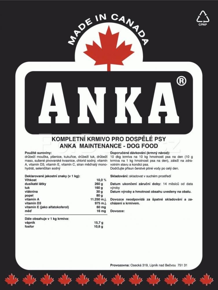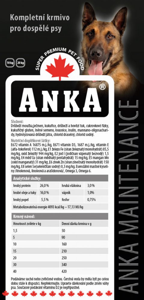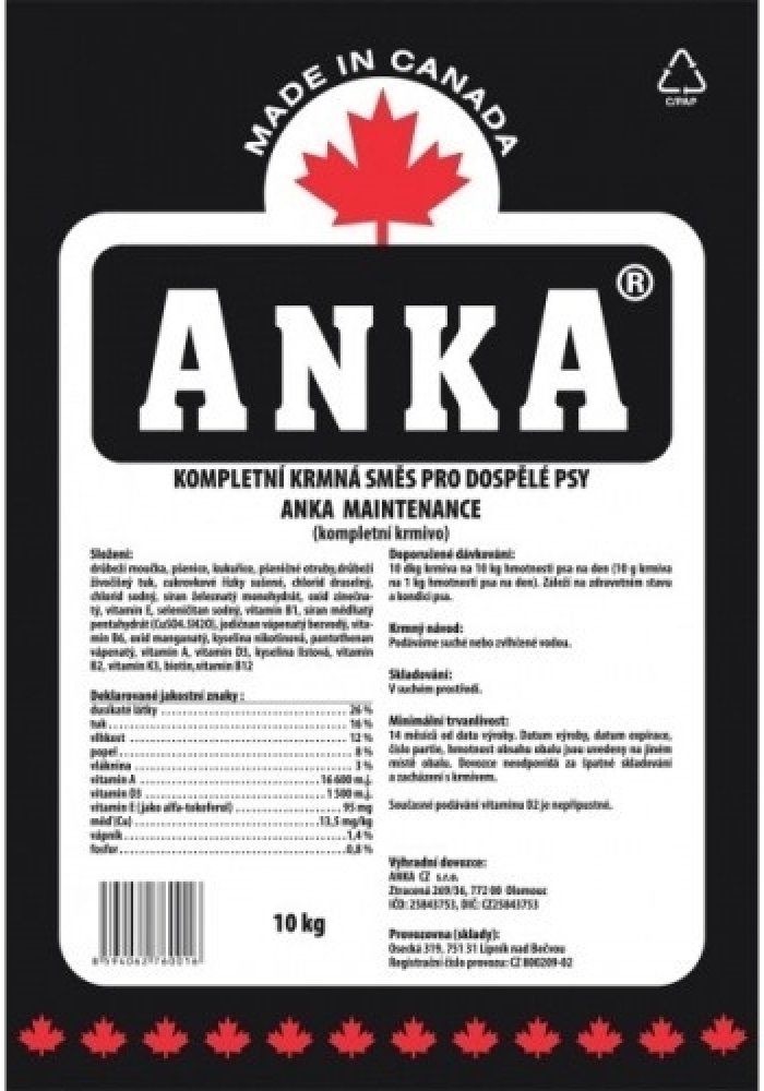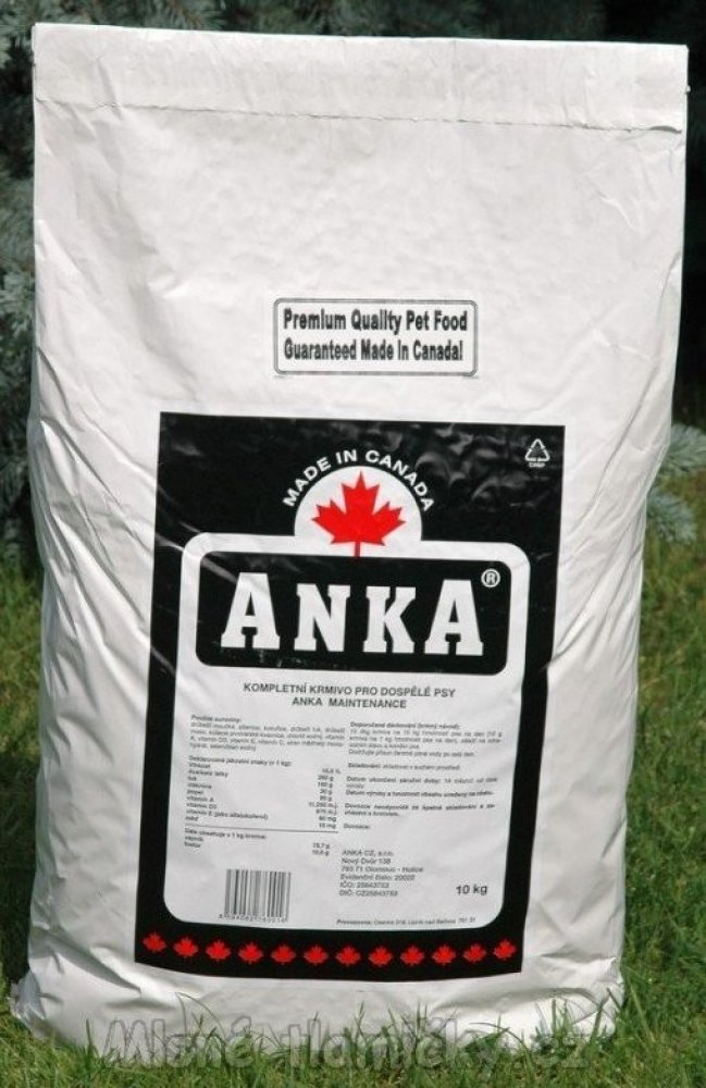 ANKA MAINTENANCE je špičková strava pro dospělé psy. Vysoký obsah všech důležitých složek ANKA MAINTENANCE přináší kompletní výživu v menších porcích - čímž se zmenšuje i objem stolice a následného úklidu. ANKA MAINTENANCE obsahuje nejkvalitnější drůbeží maso, tuk, obilniny, přírodní vitaminy a minerály - proto mnozí profesionální i amatérští chovatelé, trenéři a majitelé psích útulků dávají přednost tomuto výrobku.