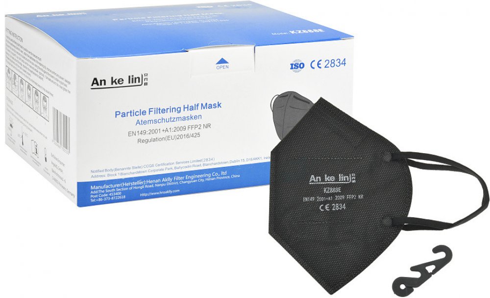 Černý respirátor AnKeLin FFP2 NR v černé barvě s filtračním efektem min. 95% bránící průniku mikroorganismů (bakterie, viry, spory plísní), jemného prachu a toxických tuhých či kapalných částic zvenku dovnitř a tím chrání dýchací ústrojí uživatele.