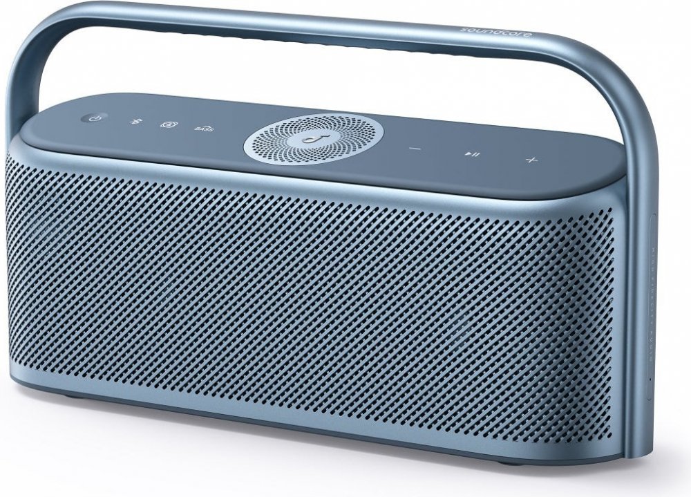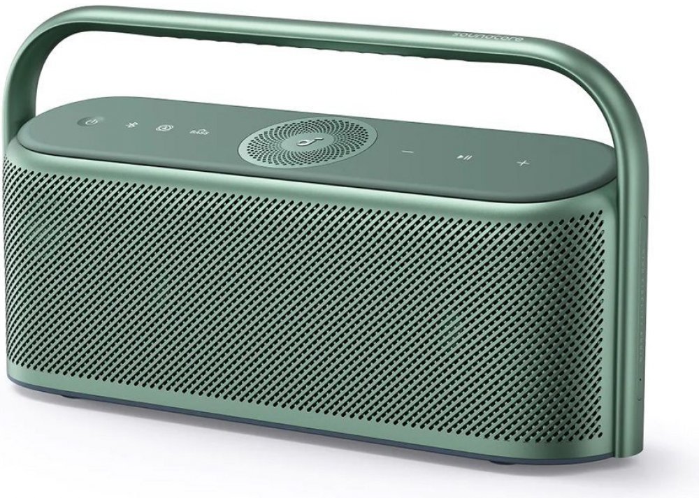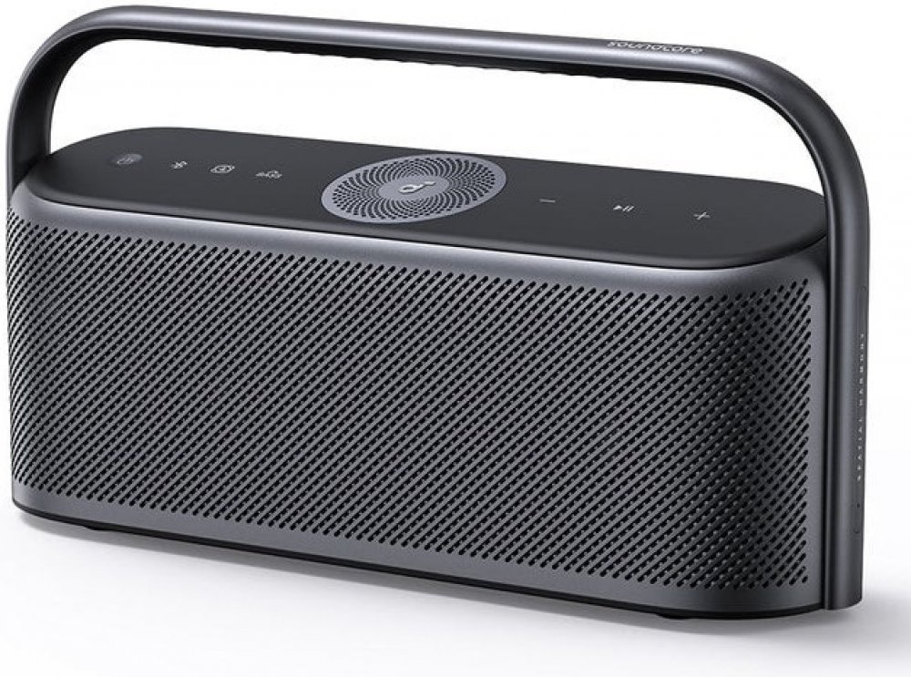 Anker SoundCore Motion X600 se pyšní **moderním a minimalistickým designem** v elegantní černé barvě. Jeho robustní, ale zároveň sofistikované tělo je doplněno **integrovaným kovovým madlem**, které nejen usnadňuje přenášení, ale také dodává reproduktoru punc luxusu a odolnosti. Přední strana je osazena **precizně perforovanou mřížkou**, která chrání reproduktory a zároveň zajišťuje optimální šíření zvuku. Na horním panelu naleznete **intuitivní dotykové ovládací prvky** a výrazný kruhový prvek, který podtrhuje celkovou estetiku a funkčnost. Každý detail je promyšlen tak, aby reproduktor nejen skvěle zněl, ale i vypadal.