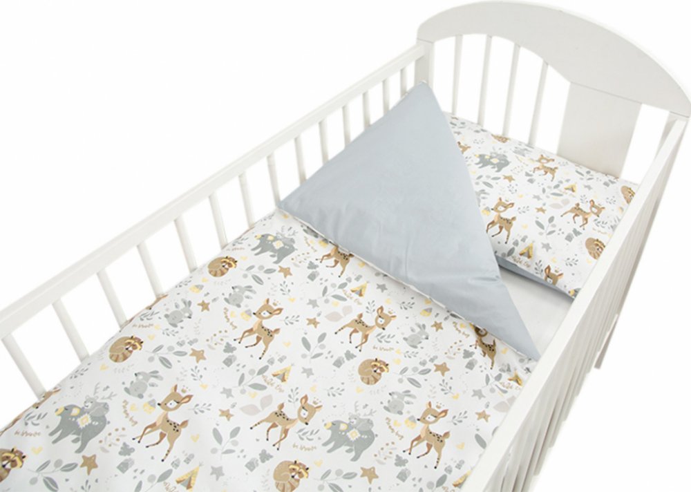 Měkoučké bavlněné povlečení do postýlky přinese vašim nejmenším pohodový spánek. Jednu stranu povlečení zdobí krásný motiv lesních zvířátek a druhá strana je šedé barvy. Díky univerzálním barvám se bude skvěle hodit do pokojíku jakéhokoliv typu.