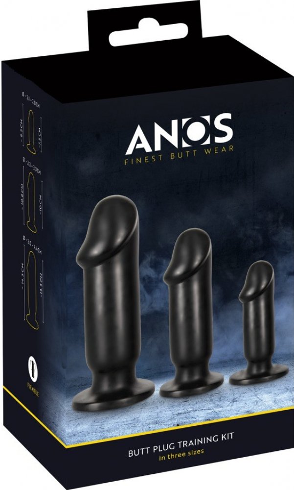 Plug trio for anal training pleasure! Butt Plug Training Kit from ANOS that includes 3 butt plugs with different sizes and weights for pleasurable stimulation or stretching and training of the anus. Each flexible plug has a realistically shaped glans and a large suction cup which means that it can be worn safely (over long periods of time) without slipping in too far. The plugs are also perfect fo...