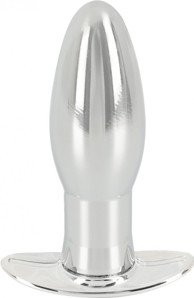 Dobíjecí vibrační kolík s pevnou základnou pro pohodlné nasednutí. Voděodolný anální kolík se 7 vibračními programy z hladkého těžkého kovu.
