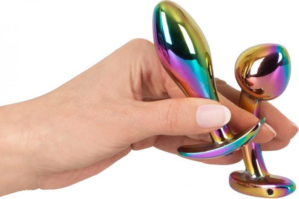 Popis tohoto produktu byl přeložen automaticky. Pokud máte otázky nebo pochybnosti, kontaktujte nás prosím. Dvě duha pro anální štěstí! Kovová tupková zástrčka nastavená v duhových barvách ANOS s 2 kovovými análními dopravními zácpami v třpytivých duhových barvách. Jeden z nich má klasický, kuželový tvar, druhý je mírně zakřivený a má profilovanou špičku tvarovanou koncovkou. To vám umožní nosit příjemně těžké kovové zátky po dlouhou dobu. Klasický jednoduchý korek je navíc vyzdoben modrým drahým kamenem v kotvě. Kovové zátky jsou také ideální pro zábavu pod vlivem teploty: stačí je vložit do lednice, aby se ochladily, nebo do vodní lázně, aby je zahřáli. 2 cm, Posuvná délka 8,2 cm, průměr max. 2,8 cm. Hmotnost 81 G. Core Bent: Celková délka 8,8 cm, Posouvá délka 7,6 cm, průměr max. 3,2 cm. Hmotnost 75 g. Kov, akryl