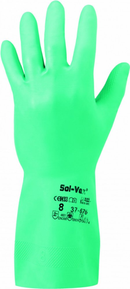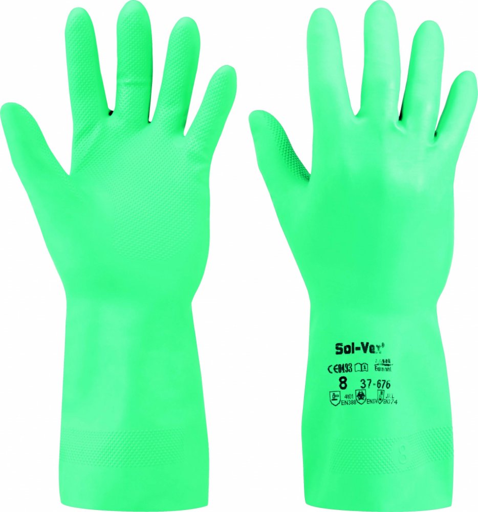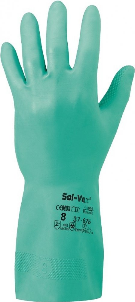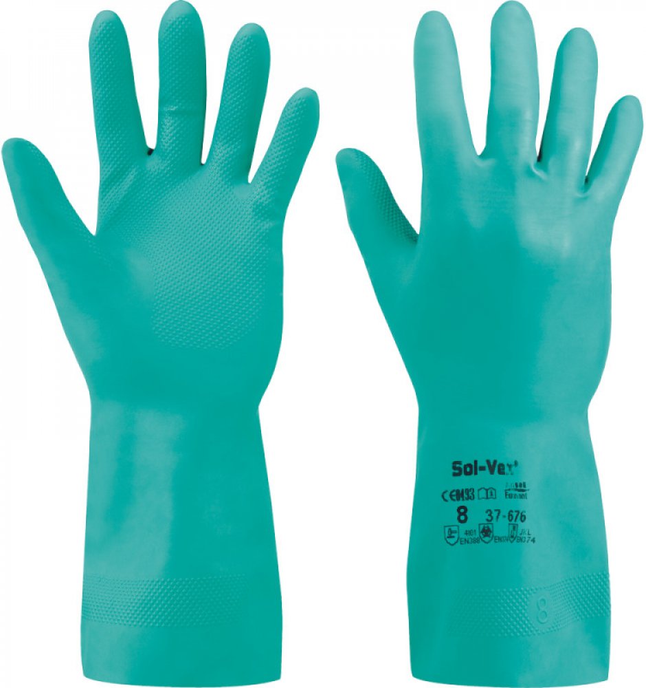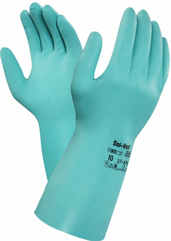 Antistatické rukavice z 0,38 mm silného nitrilu, s velurovou úpravou uvnitř, reliéfním povrchem v dlani a na prstech, v celkové délce 33 cm. Splňuje normy: EN 420, EN 388 proti mechanickým rizikům, EN 374-3 proti chemikáliím, EN 374-1 proti chemikáliím. Velikosti: 7, 8, 9, 10, 11. Rukavice jsou baleny po 12 párech.
