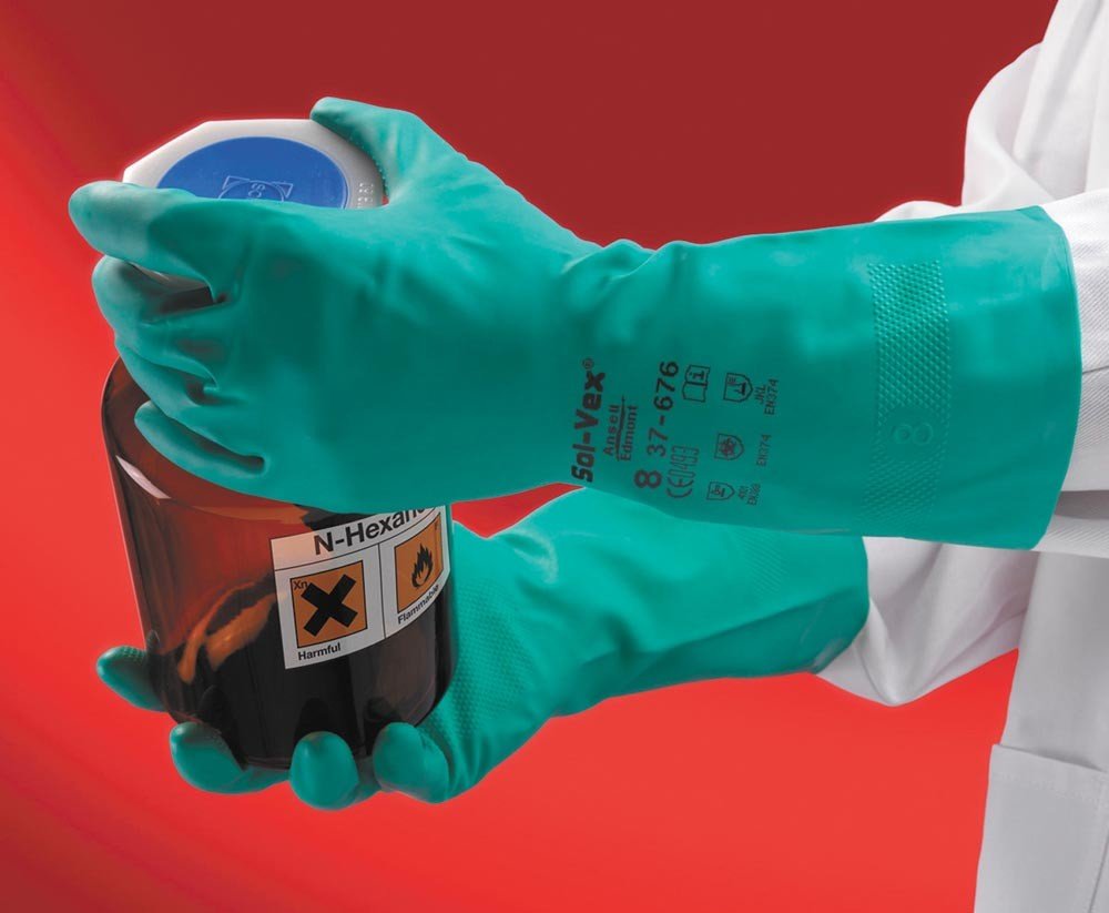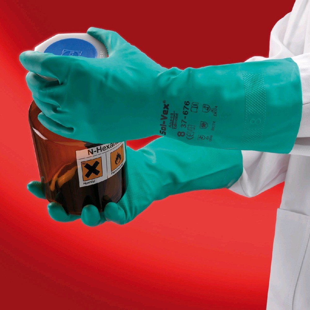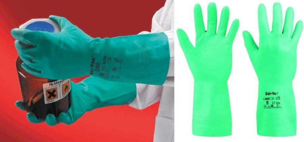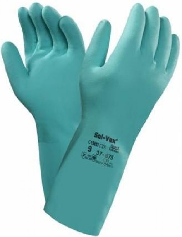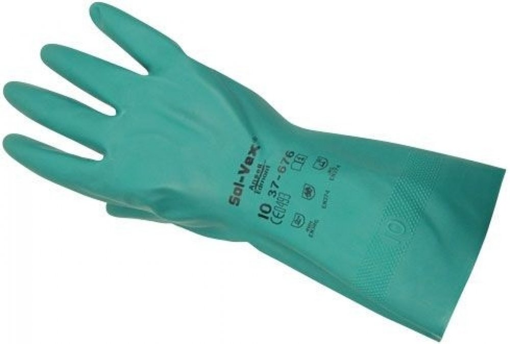 Antistatické rukavice z 0,38 mm silného nitrilu, s velurovou úpravou uvnitř, reliéfním povrchem v dlani a na prstech, v celkové délce 33 cm. Splňuje normy: EN 420, EN 388 proti mechanickým rizikům, EN 374-3 proti chemikáliím, EN 374-1 proti chemikáliím. Velikosti: 7, 8, 9, 10, 11. Rukavice jsou baleny po 12 párech.