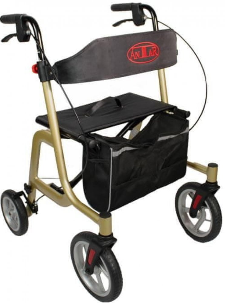 PopisParametryČtyřkolové skládací chodítko pro seniory AT51044 poskytuje podporu a zvyšuje bezpečnost a stabilitu osob s omezenou schopností chůze, čímž je klíčovým nástrojem v rehabilitaci. Vybavení zdravotního chodítka:Bederní opěrka – vyměkčenáNákupní taška (s popruhem přes rameno)Tlačítko rychlého uvolnění kolaPřední vidlicePřední kolaRukojeťBrzdyNastavitelné rukojetiŠroub pro nastavení výškyTextilní pohodlné sedátkoRámŠroub pro demontáž zadního kolaZadní kolaDržák holeNávod v češtině Technické specifikace: Šířka sedadla: 46 cm Hloubka sedadla: 25 cm Výška od země k sedadlu: 55 cm Minimální výška rukojeti: 84 cm Maximální výška držadel: 94 cm Rozměry (délka šířka výška): 75 61 94 cm Přední kolo: 25 cm Zadní kolo: 20 cm Typ kol: plné Maximální zatížení: 136 kg Váha: 7.7 kg Lehký hliníkový vozík Antar váží pouhých 7,7 kg a má měkká kola pro pohodlnou jízdu.Výškově nastavitelné rukojetiS popruhem na záda a držákem na holeRozměryHmotnost: 7,7 kgMax. Hmotnost uživatele: 136 kgCelková šířka: přibližně 61 cmCelková hloubka: cca 75 cmVýška rukojeti: 84-94 cmVelikost sedadla: 46 x 25 cmVýška sedadla: přibližně 55 cmPřední měkká kolečka: 10"Zadní měkká kolečka: 8"Barva:barva: zlatáRozsah dodávky:součástí balení je: 1 hliníkový lehký rolátor AntarVčetně popruhu na záda, nákupní tašky, držáku na hole