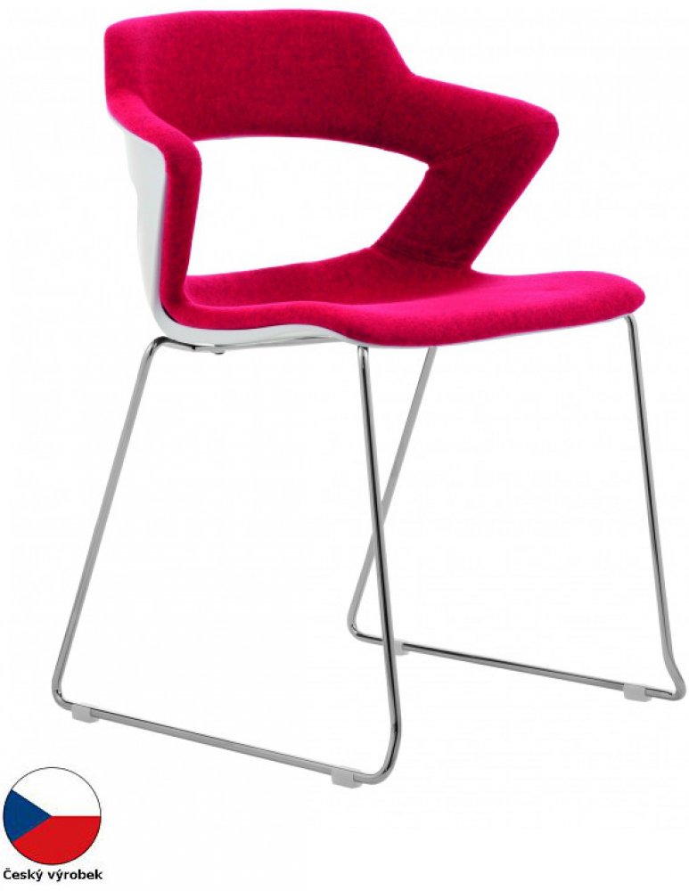 Bílý plastový korpus, celočalouněná. Ocelový ližinový rám chromovaný. Stohovatelnost 5 ks. Nosnost: 120 kg.