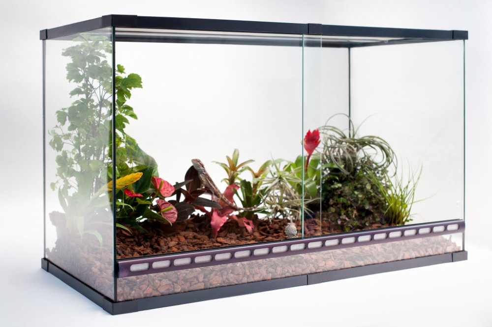 Kvalitně lepené skleněné terárium s dvojitým větráním - jedno větrání je umístěno pod posuvnými dvířky a druhé zvrchu terária. Rozměry terária 60 x 40 x 40 cm (d x š x v). Terárium je bez vybavení. Je vhodné pro středně velká terarijní zvířata - gekončík noční, scink, felsuma, aj. Obrázek je pouze ilustrační.