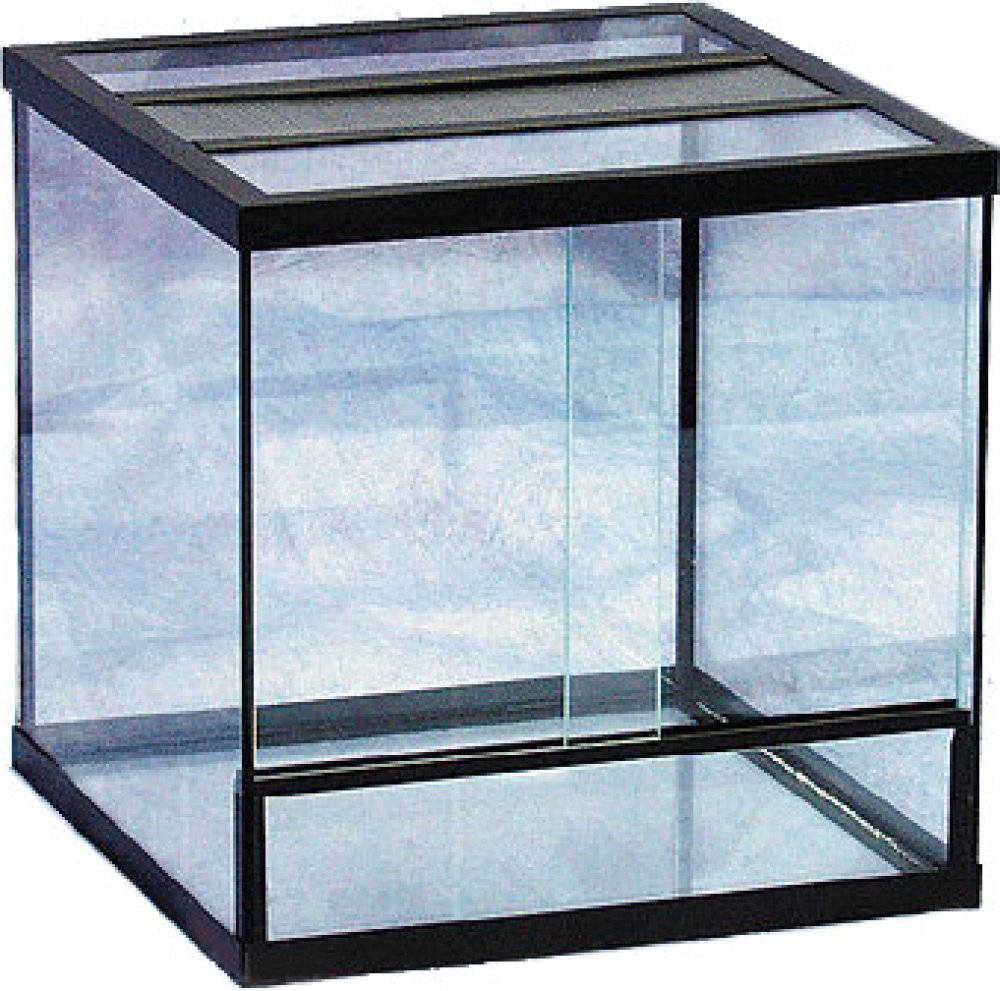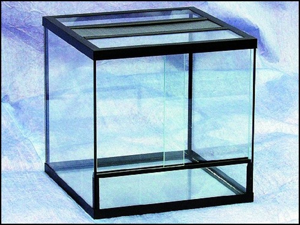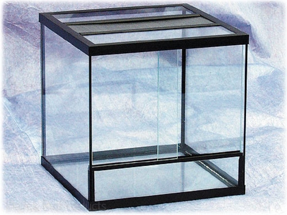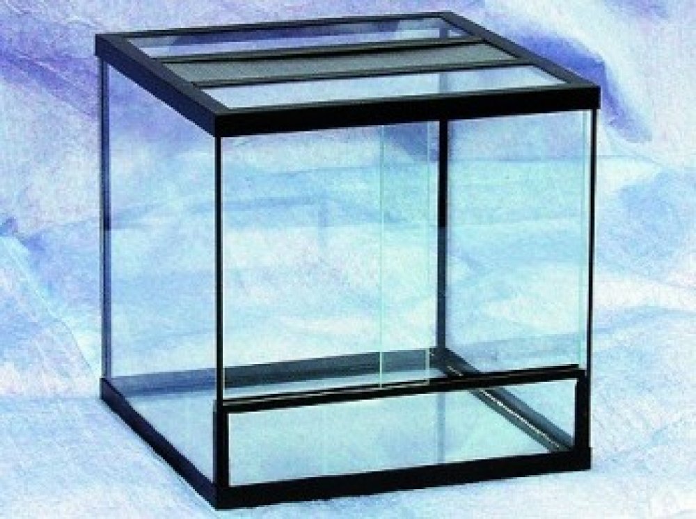 Skleněné terárium s kovovou větrací mřížkou.
